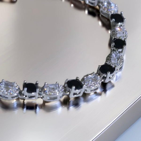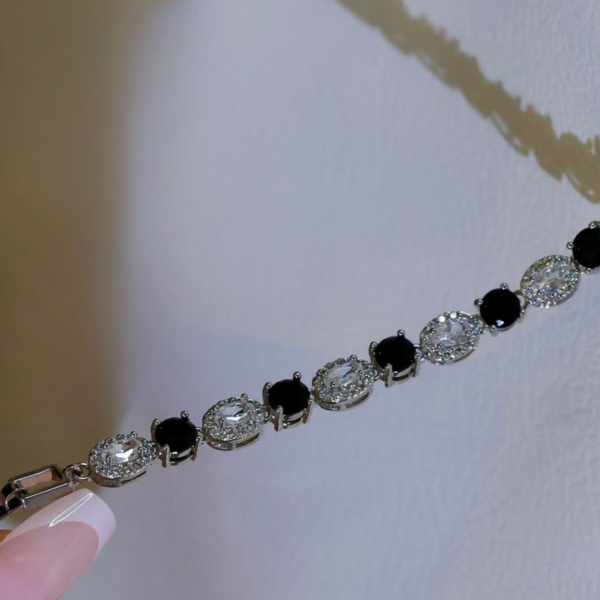 Make a bold yet elegant statement with this silver-tone bracelet featuring a striking alternating pattern of black and clear stones. Each stone is carefully set to create a captivating contrast that blends classic sophistication with modern edge. The sleek link design sits beautifully on the wrist, offering comfortable wear and a polished finish. Perfect for evening events, special occasions, or adding a touch of drama to everyday outfits, this bracelet is a timeless accessory that stands out without overpowering your look.