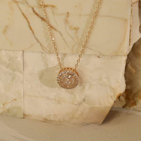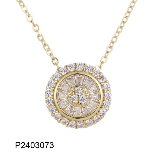 This exquisite circular pendant necklace is designed to make a subtle yet luxurious statement. Crafted in a gold-tone finish, the pendant features a beautifully layered round design with a brilliant center cluster, surrounded by baguette-cut stones and an outer halo of round, high-shine stones that reflect light from every angle.