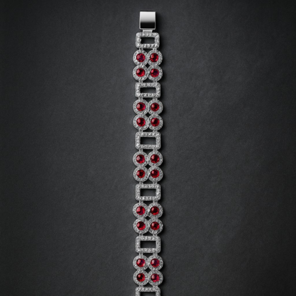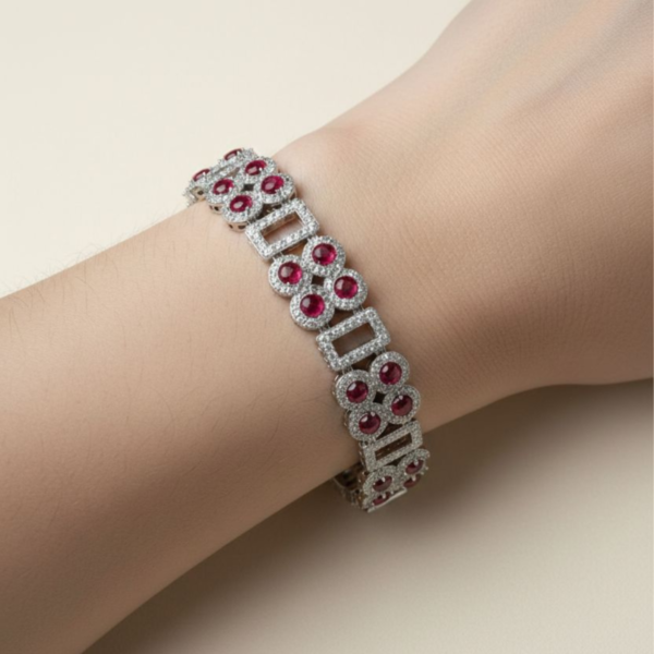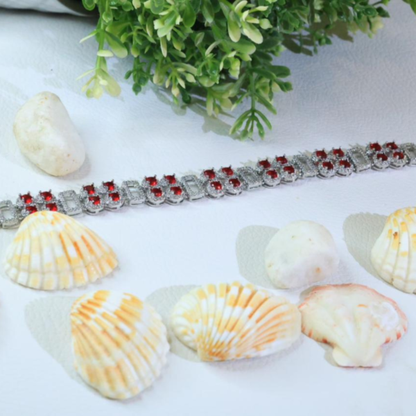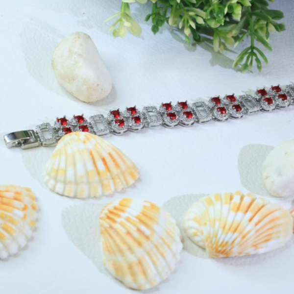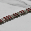 Each centerpiece cluster features four deep red gemstones arranged in a floral-inspired formation, surrounded by finely set micro-stones that enhance sparkle and depth. The contrast between the vibrant red stones and the textured silver-tone finish creates a captivating visual balance, making this bracelet a true statement accessory.
