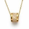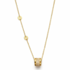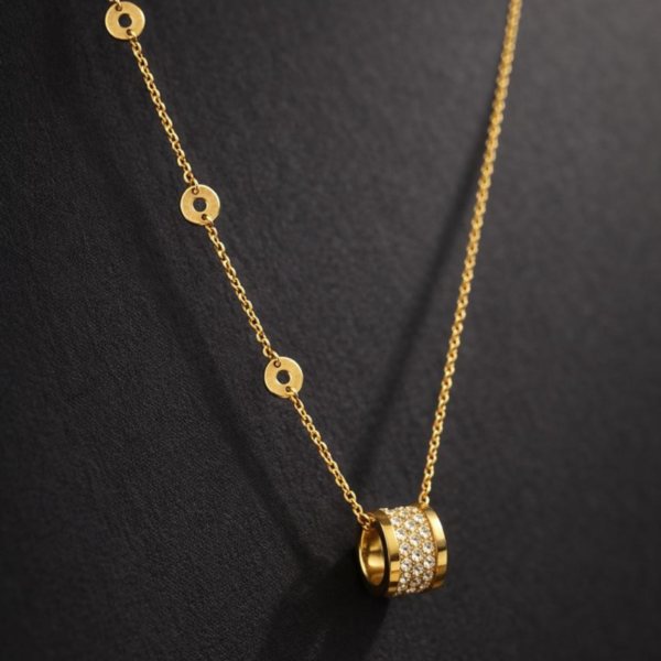 Elegant gold-tone necklace featuring a crystal-studded cylindrical pendant with delicate disc accents along the chain. A refined, modern piece designed for effortless everyday luxury.