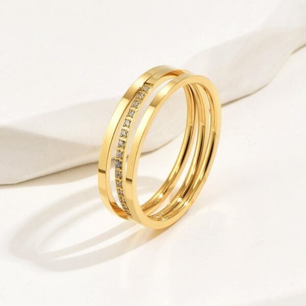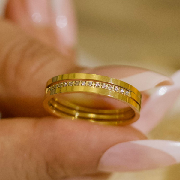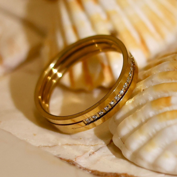 Refined and effortlessly stylish, this elegant gold band ring is designed to add a subtle touch of sparkle to your everyday look. Featuring a sleek polished gold finish with a delicate crystal inlay running along the center, this ring strikes the perfect balance between minimalism and luxury.
